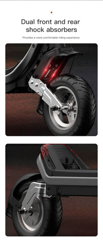 Le scooter électrique Riding Times G63 dispose d’une double crémaillère de direction télescopique, qui non seulement s’ajuste à la hauteur du pilote, mais rend également le contrôle du scooter plus précis et plus fluide.