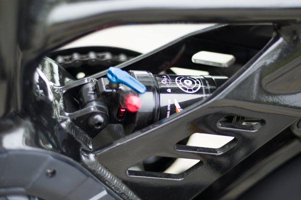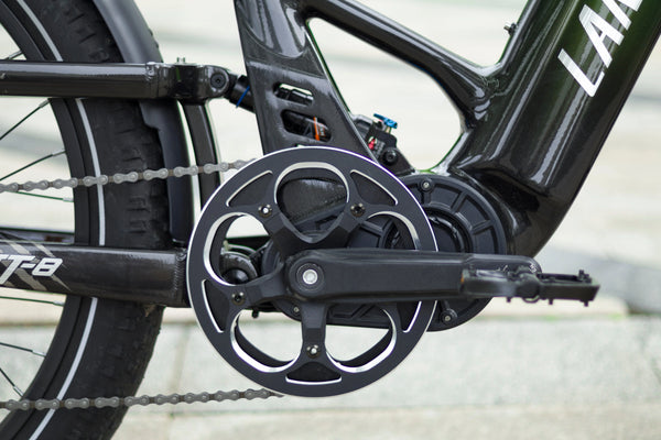 The lockable front suspension fork provides 120 mm of travel, effectively absorbing impacts from uneven surfaces, curbs, and rough pavement. The soft-tail frame supports optional DNM air rear suspension with 105 mm travel, allowing fine adjustment of air pressure, rebound, and compression. This suspension setup ensures excellent stability and comfort, even under high load conditions.
